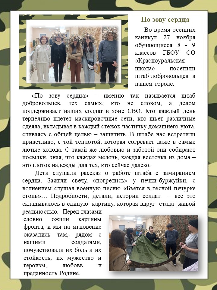 29 октября 2025 года обучающиеся 7 «А» класса ГБОУ СО «Красноуральская школа» совместно со своими сестрами и братьями посетили волонтерский штаб. Нас приветливо встретил коллектив добровольцев г. Красноуральска «По Zову Сердца» — Проскурня Елена Вениаминовна, куратор; Халикова Лидия Петровна, Юдина Ирина Анатольевна, представители коллектива; Корчагина Венера Ихсановна и Подзорова Наталья Геннадьевна, швеи.