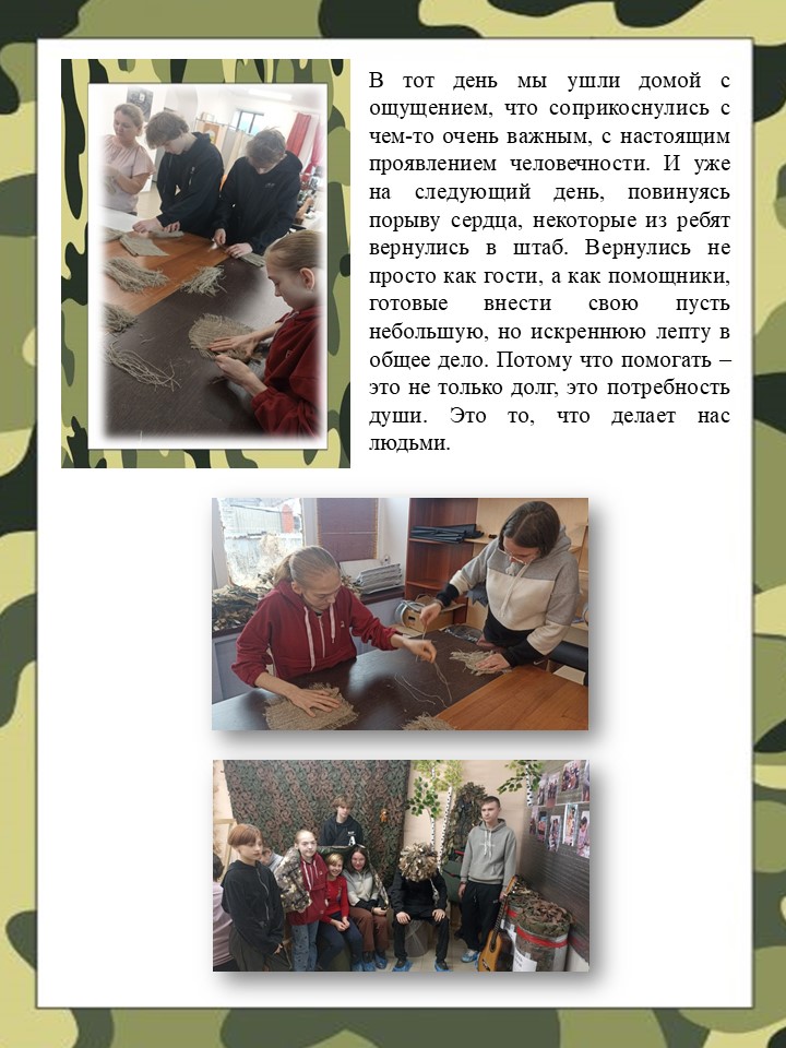 Отмечу, что работа над маскировочными сетями имеет не только практическую пользу для фронта, но и огромное воспитательное значение. Ребята учатся работать в команде, проявляют милосердие и сострадание, а также осознают свою причастность к важному делу. Это формирует в них гражданскую позицию и готовность прийти на помощь в трудные времена.